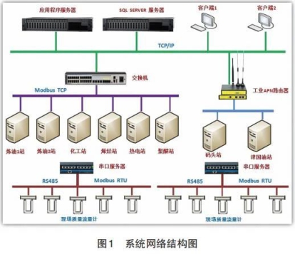 现场采集:该系统下设11个iFix SCADA现场采集站,质量流量计按照菊花链连接方式形成 RS485 通信总线,并将 Modbus RTU协议转换为标准Modbus TCP协议实现数据采集与监控。