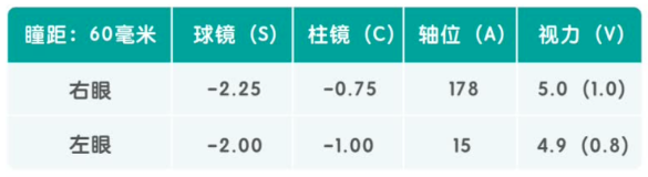 其中,“S”下面对应的数值前如果是“-”则表示近视,“+”则表示远视。比如此验光单中,右眼镜片为近视225度,合并近视散光75度,散光轴位是178度,戴眼镜后的矫正视力是5.0(1.0);左眼镜片为近视200度,合并近视散光100度,散光轴位是15度,戴眼镜后的矫正视力是4.9(0.8)。