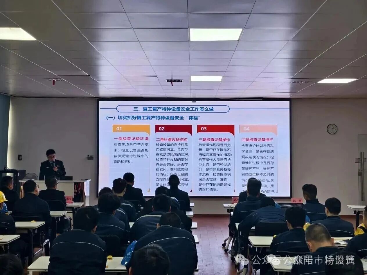 此次培训面向特种设备安全管理人员、作业人员展开,聚焦节后复工特种设备安全要点,采用“视频宣传+案例警示+理论讲解”相结合的方式,结合近期特种设备典型事故案例,深入剖析违规操作、设备带病运行、维护不到位等引发事故的原因,明确法律后果。培训旨在用“身边事”警醒“身边人”,引导大家深刻认识特种设备安全的重要性,克服麻痹思想、侥幸心理。