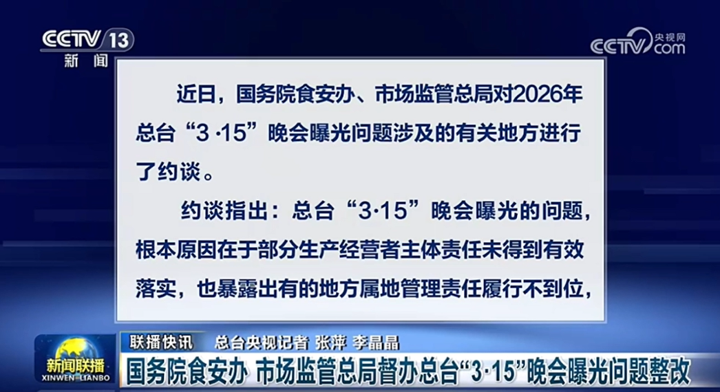 国务院食安办 市场监管总局督办 总台“3・15”晚会曝光问题整改