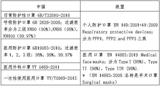我国通常将口罩分为民用口罩和医用口罩。为便于理解,特将中国口罩类型及标准和欧盟的口罩类型及适用标准相对应,帮助大家了解您的口罩可能对应的是那种欧盟口罩,以及需要满足那个标准的要求。需要说明的是这种对应并不是严格的对应,并且中欧标准要求也有差异,请大家自己根据标准的详细要求分析并判定。