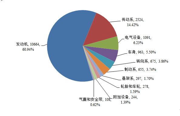 2018年全国汽车产品缺陷信息采集系统共收到2.48万条消费者提交的汽车产品缺陷线索报告(见图1)。按缺陷部位所属车辆总成分类,涉及发动机总成的缺陷报告10664例,占60.94%;其次是传动系2524例,占14.42%;电气设备1091例,占6.23%;车身963例,占5.50%;转向系675例,占3.86%;制动系655例,占3.74%;悬架系297例,占1.70%;轮胎和车轮278例,占1.59%;附加设备244例,占1.39%;气囊和安全带108例,占0.62%(见图2)。