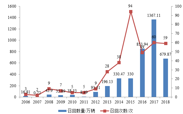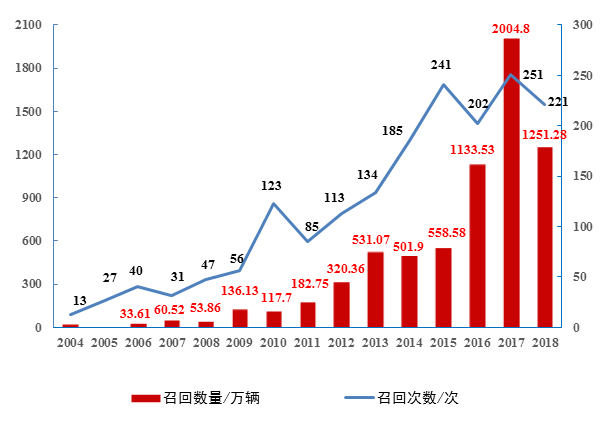 2018年全年共实施汽车召回221次,涉及缺陷车辆1251.28万辆,召回次数和召回数量分别比2017年减少12%和37.6%(2017年峰值是因高田气囊召回造成的)。截至2018年底,我国累计实施汽车召回1768次,涉及缺陷车辆6925万辆,汽车产品生产者因召回而投入直接费用总计约529亿元,累计挽回消费者损失520亿元。近五年年均召回次数220次,近每两天发生一次召回,实施召回已经成为汽车生产企业的常态化活动。2004年至2018年我国汽车召回次数与数量如图3所示。