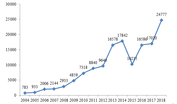 图1 2004年-2018年汽车产品缺陷线索报告数量