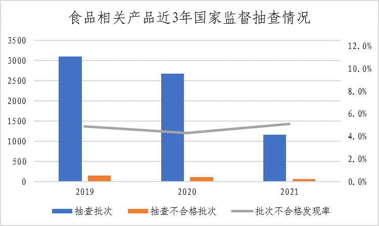 (一)抽查概况。本次抽查了1170家企业生产的1172批次产品,涉及婴幼儿用塑料奶瓶、纸杯、一次性竹木筷、压力锅、餐具洗涤剂、密胺塑料餐具、塑料一次性餐饮具、复合膜袋、非复合膜袋、食品接触用纸容器、工业和商用电热食品加工设备、工业和商用电动食品加工设备等12种产品。其中,5批次产品涉嫌超范围生产、无证生产等,已移送企业所在地市场监管部门处理。对1165家企业生产的1167批次产品进行了检验,检出59批次产品不合格,不合格发现率为5.1%。食品相关产品近三年整体不合格发现率分别为4.9%、4.3%、5.1%。
