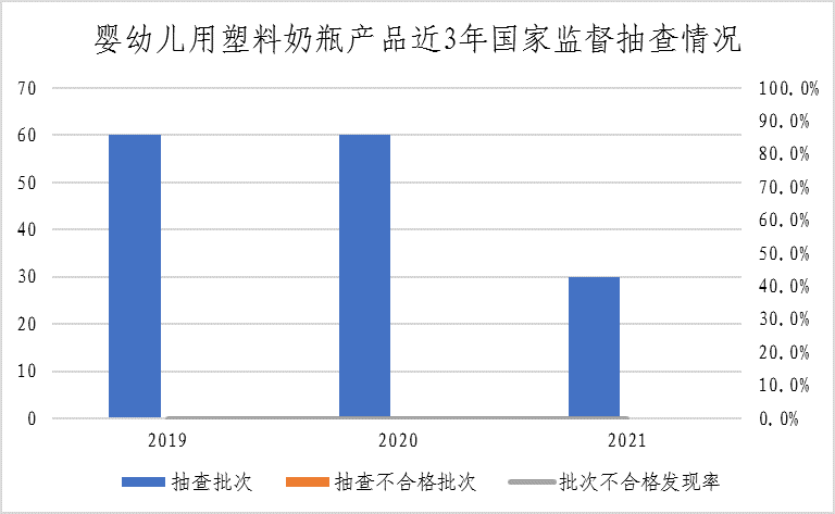 (一)婴幼儿用塑料奶瓶。本次共抽查4个省30家企业生产的30批次婴幼儿用塑料奶瓶产品。重点对感官要求、总迁移量、高锰酸钾消耗量、重金属(以Pb计)、脱色试验、特定迁移量(以锑计)、特定迁移总量(以己内酰胺计)、特定迁移总量(以对苯二甲酸计)、特定迁移总量(以乙二醇计)等9个项目进行了检验。本次抽查未发现不合格产品。该产品近三年均未发现不合格。