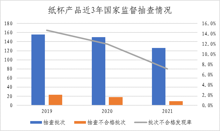 (二)纸杯。本次共抽查17个省(区、市)126家企业生产的126批次纸杯产品,发现9批次产品不合格,不合格发现率为7.1%,较上次抽查下降4.9个百分点。该产品近三年整体不合格发现率分别为14.7%、12.0%、7.1%。本次重点对感官要求、铅、砷、甲醛、荧光性物质、总迁移量、高锰酸钾消耗量、重金属(以Pb计)、大肠菌群、沙门氏菌、霉菌、感官指标、渗漏性能、杯身挺度等14个项目进行了检验。不合格项目涉及感官指标、渗漏性能、杯身挺度。