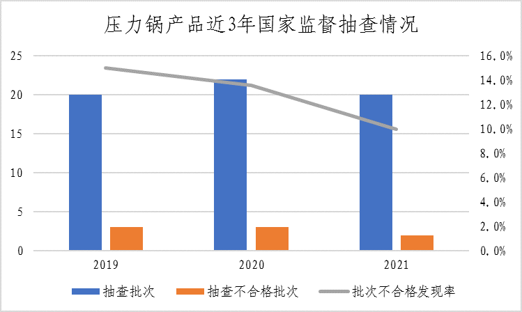 (四)压力锅。本次共抽查3个省21家企业生产的21批次压力锅产品,其中1批次产品涉嫌无证生产,已移送企业所在地市场监管部门处理。检验的20批次产品中,有2批次不合格,不合格发现率为10.0%,较上次抽查下降3.6个百分点。该产品近三年整体不合格发现率分别为15.0%、13.6%、10.0%。本次抽查重点对产品合盖安全性、工作压力、密封性、安全压力、耐热压、开盖安全性、防堵安全性、耐内压力、泄压压力、破坏压力、手柄连接牢固性、与食品接触部位安全要求等12个项目进行了检验。不合格项目为泄压压力。