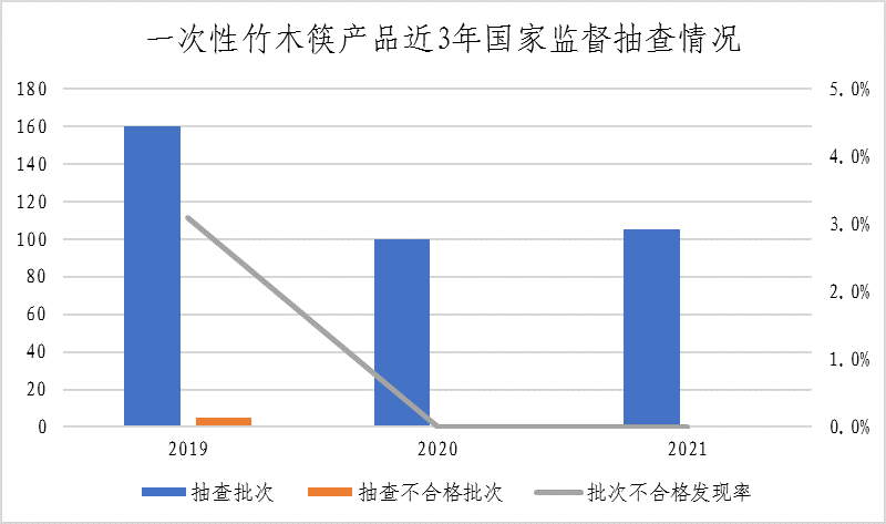 (三)一次性竹木筷。本次共抽查11个省(区、市)106家企业生产的106批次一次性竹木筷产品。其中1批次产品涉嫌超范围生产,已移送企业所在地市场监管部门处理。检验的105批次产品中,重点对大肠菌群、沙门氏菌、志贺氏菌、金黄色葡萄球菌、溶血性链球菌、霉菌、二氧化硫浸出量、噻苯咪唑、邻苯基苯酚、联苯、抑霉唑等11个项目进行了检验。本次抽查未发现不合格产品。该产品近三年整体不合格发现率分别为3.1%、0.0%、0.0%。