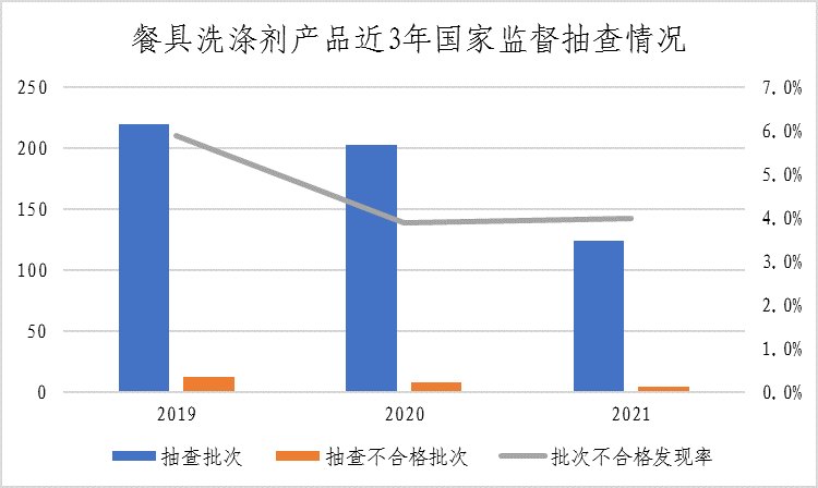 (五)餐具洗涤剂。本次共抽查13个省(市)122家企业生产的124批次餐具洗涤剂产品,其中5批次产品不合格,不合格发现率为4.0%,较上次抽查上升0.1个百分点。该产品近三年整体不合格发现率分别为5.9%、3.9%、4.0%。本次抽查重点对总活性物含量、pH、荧光增白剂、甲醇含量、甲醛、总五氧化二磷(P2O5)含量、有效酸的质量分数(以H2SO4计)、总碱的质量分数(以NaOH计)、腐蚀率、砷(As)、重金属(以Pb计)、菌落总数和大肠菌群等13个项目进行了检验。不合格项目为甲醛、总活性物含量和菌落总数。