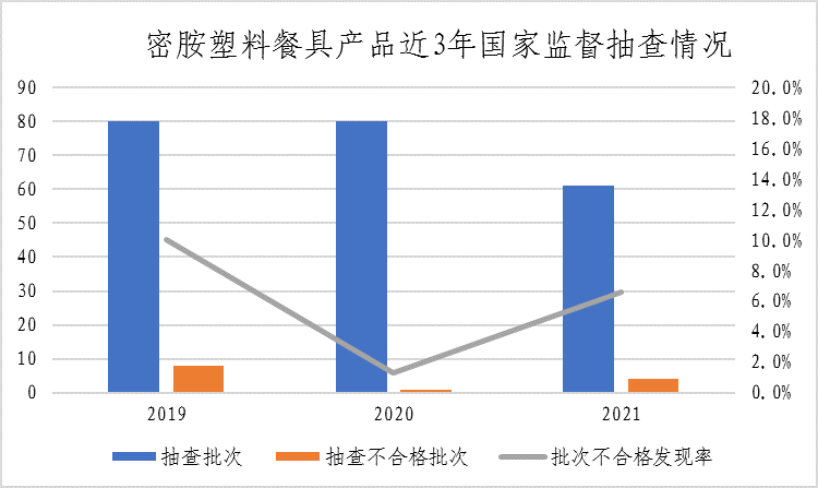 (六)密胺塑料餐具。本次共抽查7个省(市)61家企业生产的61批次密胺塑料餐具产品,其中4批次产品不合格,不合格发现率为6.6%,较上次抽查上升5.3个百分点。该产品近三年整体不合格发现率分别为10.0%、1.3%、6.6%。本次抽查重点对感官要求、总迁移量、高锰酸钾消耗量、重金属(以Pb计)、脱色试验、三聚氰胺特定迁移量、特定迁移总量(以甲醛计)、耐干热性、耐低温性、耐湿热性、耐污染性、翘曲(地部)、跌落等13个项目进行了检验。不合格项目为总迁移量、耐干热性、耐污染性。