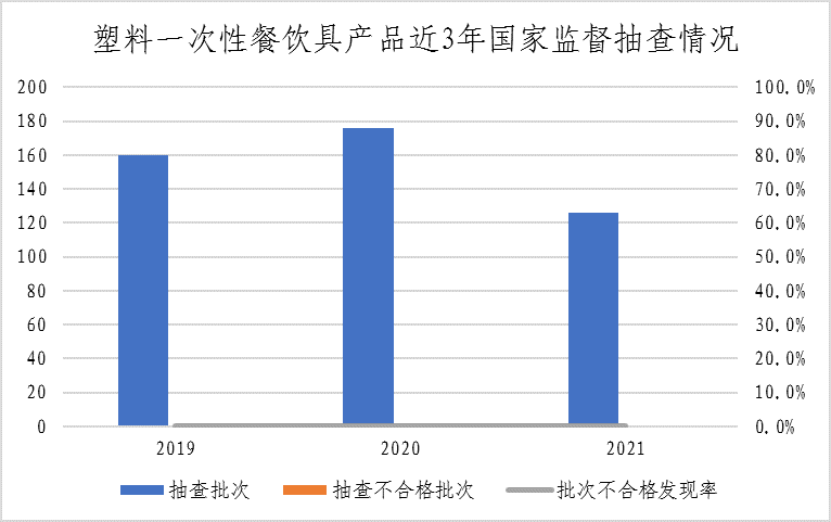 (七)塑料一次性餐饮具。本次共抽查14个省(市)127家企业生产的127批次塑料一次性餐饮具产品,其中1批次产品涉嫌超范围生产,已移送企业所在地市场监管部门处理。检验的126批次产品中,重点对感官要求、总迁移量、高锰酸钾消耗量、重金属(以Pb计)、脱色试验、特定迁移量(以锑计)、特定迁移总量(以己内酰胺计)、氯乙烯特定迁移量、大肠菌群、致病菌(沙门氏菌)、霉菌计数、特定迁移总量(以对苯二甲酸计)、特定迁移总量(以乙二醇计)、1,3-丁二烯特定迁移量、苯乙烯和乙苯残留量、邻苯类增塑剂特定迁移量等16个项目进行了检验,本次抽查未发现不合格产品。该产品近三年均未发现不合格。