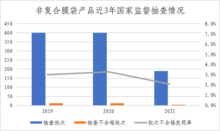 (九)非复合膜袋。本次共抽查18个省(区、市)189家企业生产的189批次非复合膜袋产品,其中4批次产品不合格,不合格发现率为2.1%,较上次抽查下降1.2个百分点。该产品近三年整体不合格发现率分别为3.0%、3.3%、2.1%。本次抽查重点对感官要求、总迁移量、高锰酸钾消耗量、重金属(以Pb计)、脱色试验、特定迁移总量(以己内酰胺计)、氯乙烯特定迁移量、邻苯类增塑剂特定迁移量、阻隔性能(氧气)、阻隔性能(水蒸气)、热封强度等11个项目进行了检验。不合格项目为阻隔性能(水蒸气)。
