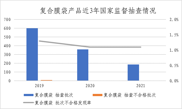 (八)复合膜袋。本次共抽查13个省(区、市)188家企业生产的188批次复合膜袋产品,其中1批次产品涉嫌超范围生产,已移送企业所在地市场监管部门处理。检验的187批次产品中,有2批次产品不合格,不合格发现率为1.1%。该产品近三年整体不合格发现率分别为1.3%、1.1%、1.1%。本次抽查重点对感官指标、蒸发残渣/总迁移量、高锰酸钾消耗量、重金属(以Pb计)、溶剂残留量总量、苯类溶剂残留量、甲苯二胺(4%乙酸)、邻苯类增塑剂特定迁移量、微生物总数/菌落总数、致病菌、大肠菌群、霉菌、阻隔性能(氧气)、阻隔性能(水蒸气)、热封强度等15个项目进行了检验。不合格项目为溶剂残留量总量。