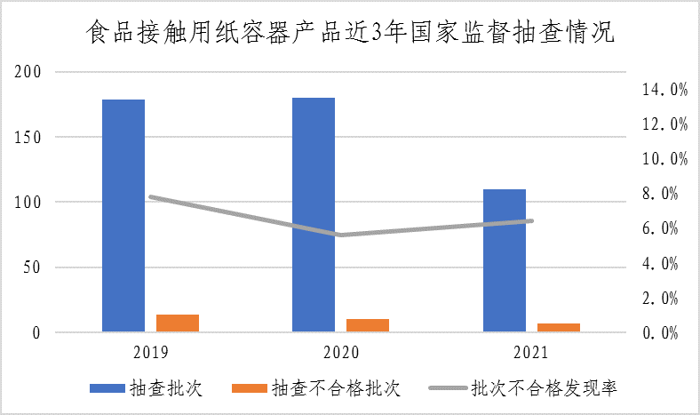 (十)食品接触用纸容器。本次共抽查11个省(市)111家企业生产的111批次食品接触用纸容器产品,其中1批次产品涉嫌无证生产,已移送企业所在地市场监管部门处理。检验的110批次产品中,有7批次产品不合格,不合格发现率为6.4%,较上次抽查上升0.8个百分点。该产品近三年整体不合格发现率分别为7.8%、5.6%、6.4%。本次抽查重点对感官要求、铅(Pb)、砷(As)、甲醛、荧光性物质、总迁移量、高锰酸钾消耗量、重金属(以Pb计)、大肠菌群、沙门氏菌、霉菌、渗漏性能、抗压强度、端盖脱离力、轴向压溃力、快速泄漏试验和耐温试验等17个项目进行了检验。不合格项目为耐温试验、快速泄漏试验、抗压强度项目。