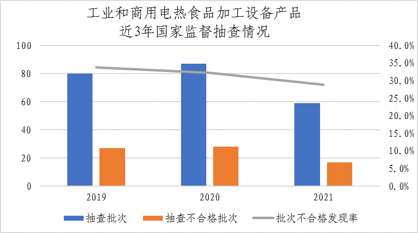 (十一)工业和商用电热食品加工设备。本次共抽查3个省59家企业生产的59批次工业和商用电热食品加工设备产品,其中17批次产品不合格,不合格发现率为28.8%,较上次抽查下降3.4个百分点。该产品近三年整体不合格发现率分别为33.8%、32.2%、28.8%。本次抽查重点对不锈钢制品的理化指标(砷、镉、铅、镍、铬)和其他金属材料及制品的理化指标(砷、镉、铅)、对触及带电部件的防护、输入功率和电流、工作温度下的泄漏电流和电气强度、泄漏电流和电气强度、非正常工作、稳定性和机械危险、机械强度、结构、内部布线、电源连接和外部软线、外部导线用接线端子、接地措施、螺钉和连接、接地电阻、冷态电气强度和绝缘电阻、安全防护、控制装置、稳定性、工作温度下泄漏电流、工作温度下电气强度、防触电、卫生结构等30个项目进行了检验。不合格项目为对触及带电部件的防护、输入功率和电流、泄漏电流和电气强度、非正常工作、稳定性和机械危险、电源连接和外部软线、接地措施、螺钉和连接。