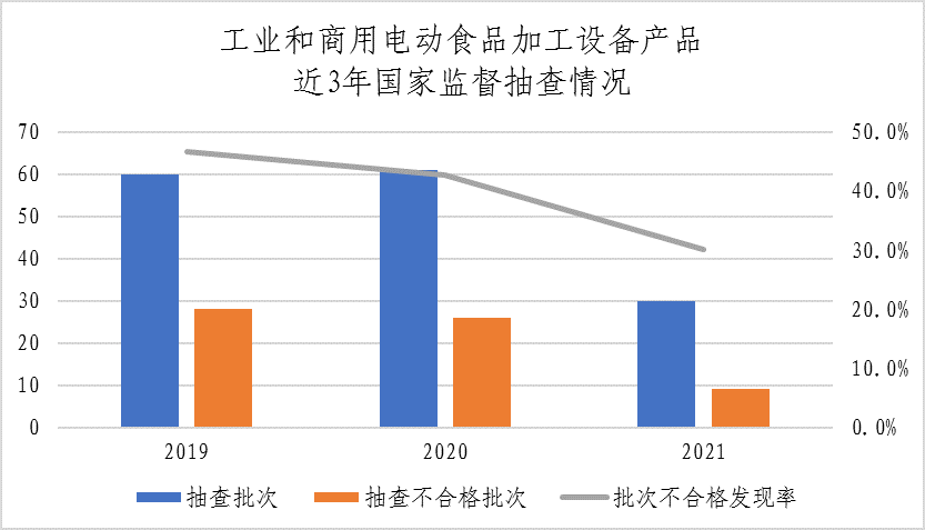 (十二)工业和商用电动食品加工设备。本次共抽查6个省(市)30家企业生产的30批次工业和商用电动食品加工设备产品,其中9批次不合格,不合格发现率为30.0%,较上次抽查下降12.6个百分点。该产品近三年整体不合格发现率分别为46.7%、42.6%、30.0%。本次抽查重点对不锈钢制品的理化指标(砷、镉、铅、镍、铬)和其他金属材料及制品的理化指标(砷、镉、铅)、对触及带电部件的防护、输入功率和电流、工作温度下的泄漏电流和电气强度、泄漏电流和电气强度、非正常工作、稳定性和机械危险、机械强度、结构、内部布线、电源连接和外部软线、外部导线用接线端子、接地措施、螺钉和连接、设备结构的安全卫生性、设备结构的可洗净性、设备可拆卸性和设备安全卫生检查的方便性等25个项目进行了检验。不合格项目为非正常工作、稳定性和机械危险、结构、内部布线、电源连接和外部软线、外部导线用接线端子、接地措施、设备结构的安全卫生性。
