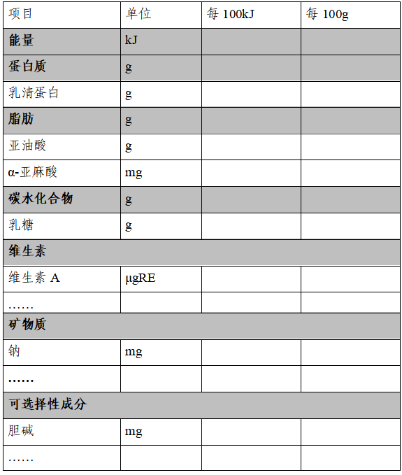 ②营养成分应当按照《食品安全国家标准 婴儿配方食品》(GB 10765)和《食品安全国家标准 较大婴儿和幼儿配方食品》(GB 10767)规定的顺序列出。GB 10765和GB 10767规定之外的,按《食品安全国家标准 食品营养强化剂使用标准》(GB 14880)等规定的顺序列出,并按照能量、蛋白质、脂肪、碳水化合物、维生素、矿物质、可选择性成分等类别分类列出。表1举例婴儿配方乳粉营养成分表格式: